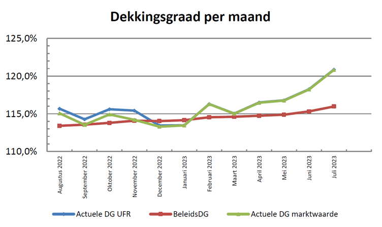De actuele dekkingsgraad van ons pensioenfonds is eind juli 2023: 120,9% (mei: 118,3%). De beleidsdekkingsgraad is 116,0%. De beleidsdekkingsgraad is de gemiddelde dekkingsgraad over de afgelopen 12 maanden.