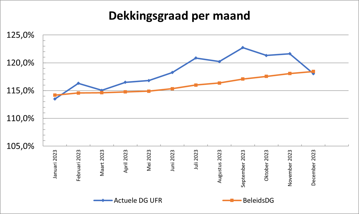 De actuele dekkingsgraad van ons pensioenfonds is eind december 2023: 118,1% (november: 121,6%). De beleidsdekkingsgraad is 118,4%. De beleidsdekkingsgraad is de gemiddelde dekkingsgraad over de afgelopen 12 maanden.
