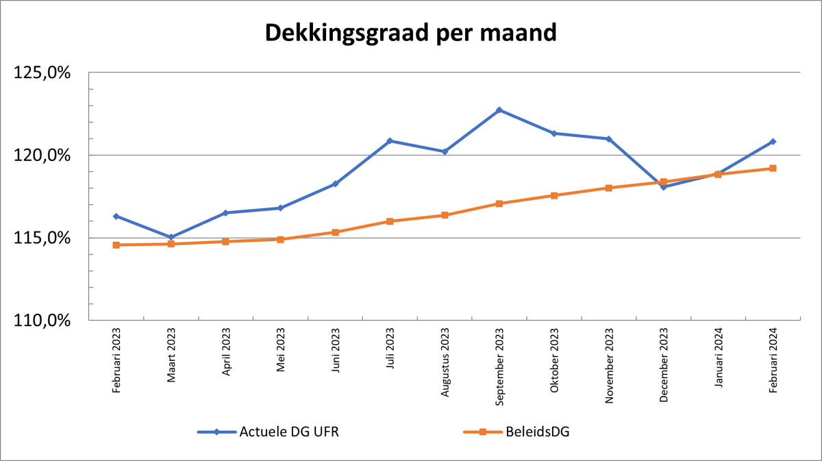De actuele dekkingsgraad van ons pensioenfonds is eind februari 2024: 120,8% (januari 2024: 118,9%). De beleidsdekkingsgraad is 119,2%. De beleidsdekkingsgraad is de gemiddelde dekkingsgraad over de afgelopen 12 maanden.